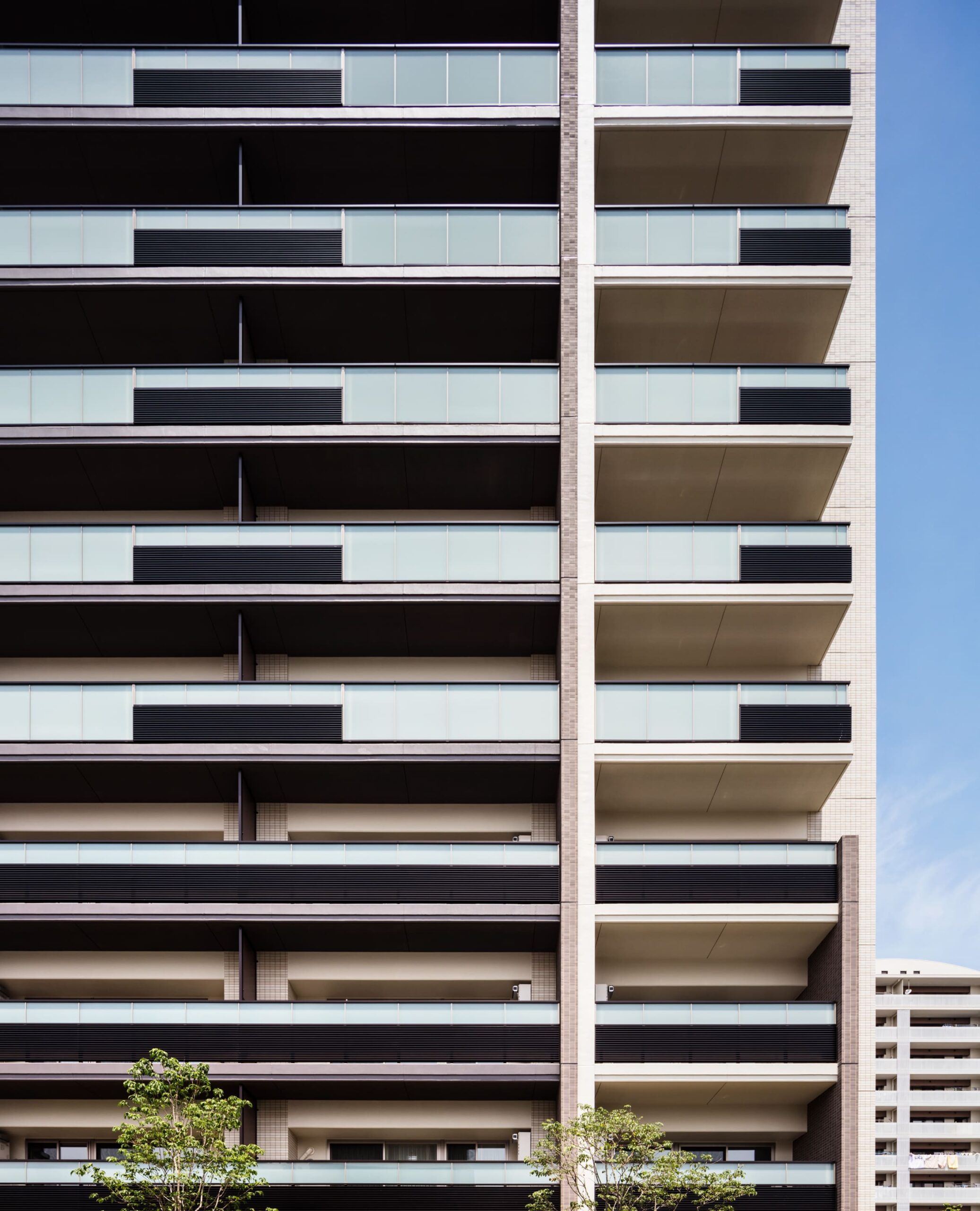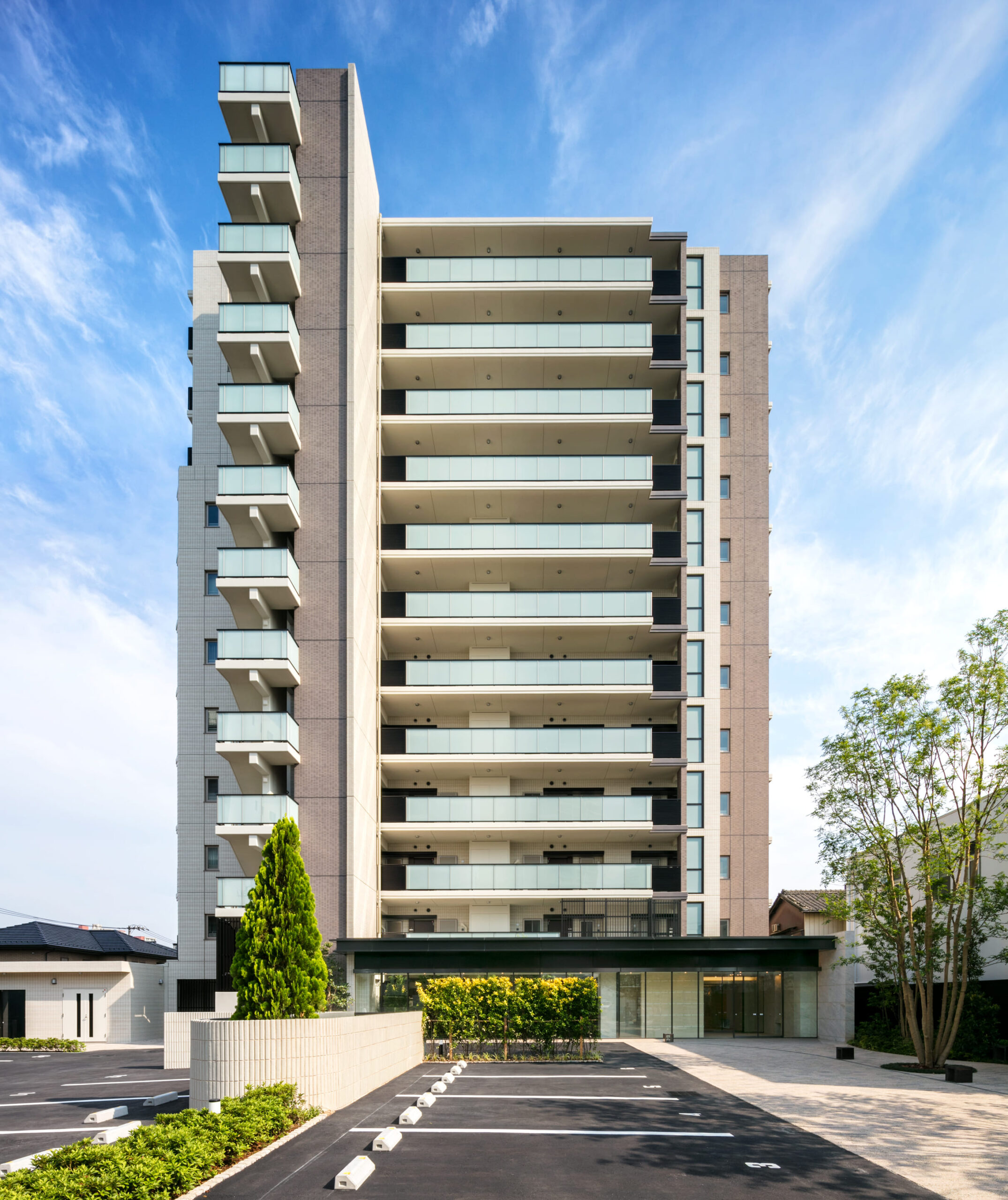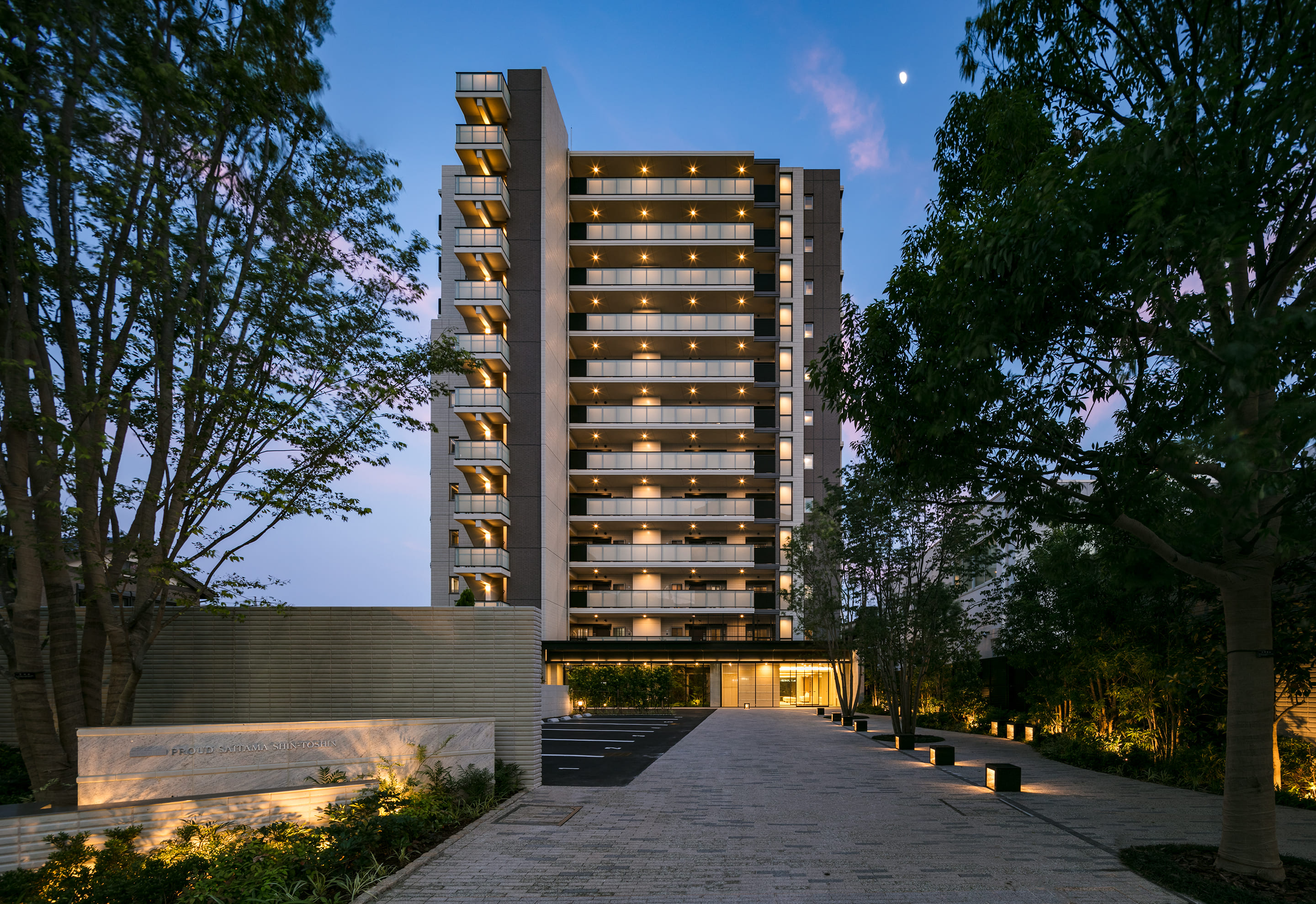 建物のエントランス側の外構は機械駐車場も設けず平置き駐車場で構成し、空地率の多い集合住宅である。敷地入口から建物までの細長いアプローチは車路と一体化させ、視覚的に同一化したデザインとし、緑地・緑化を組み合わせて充実させた空間とした。