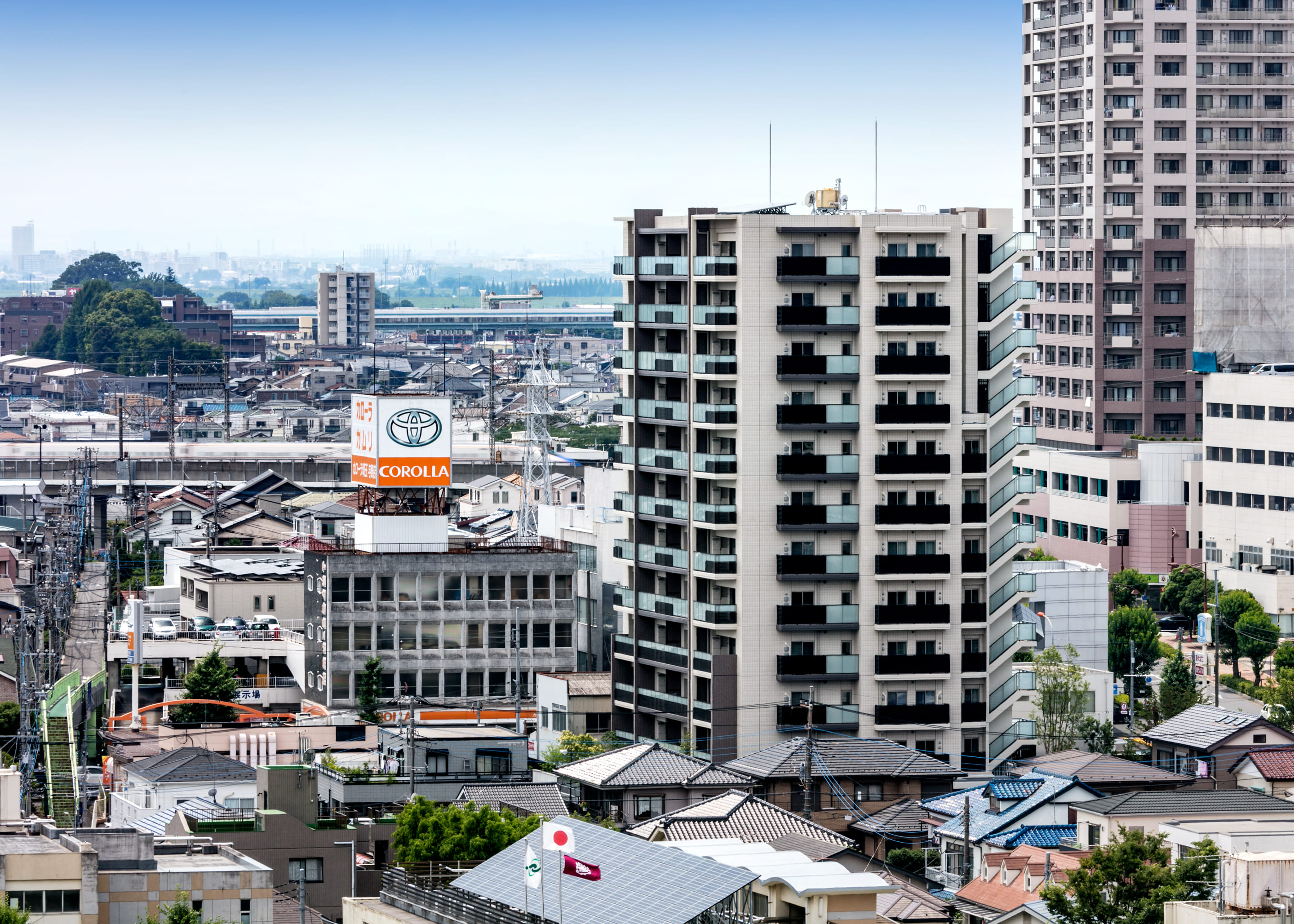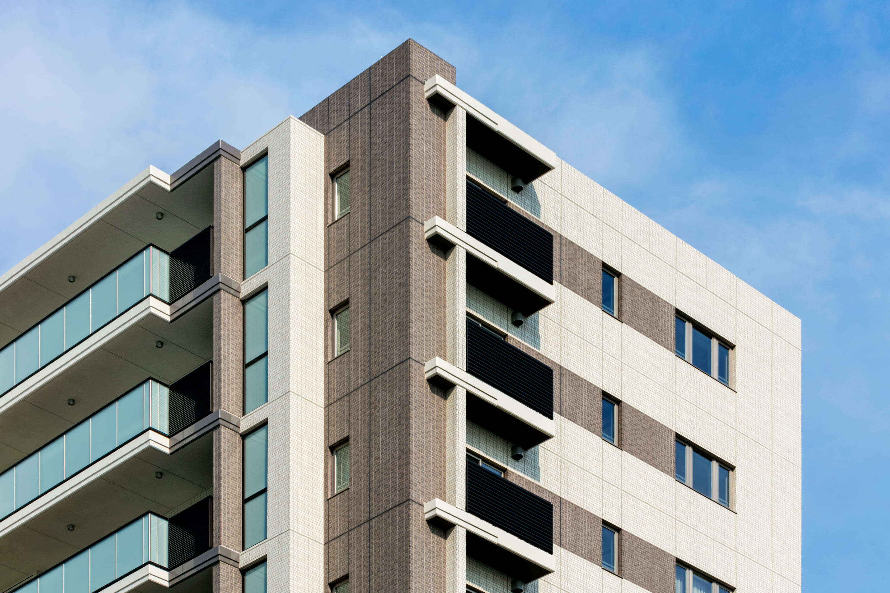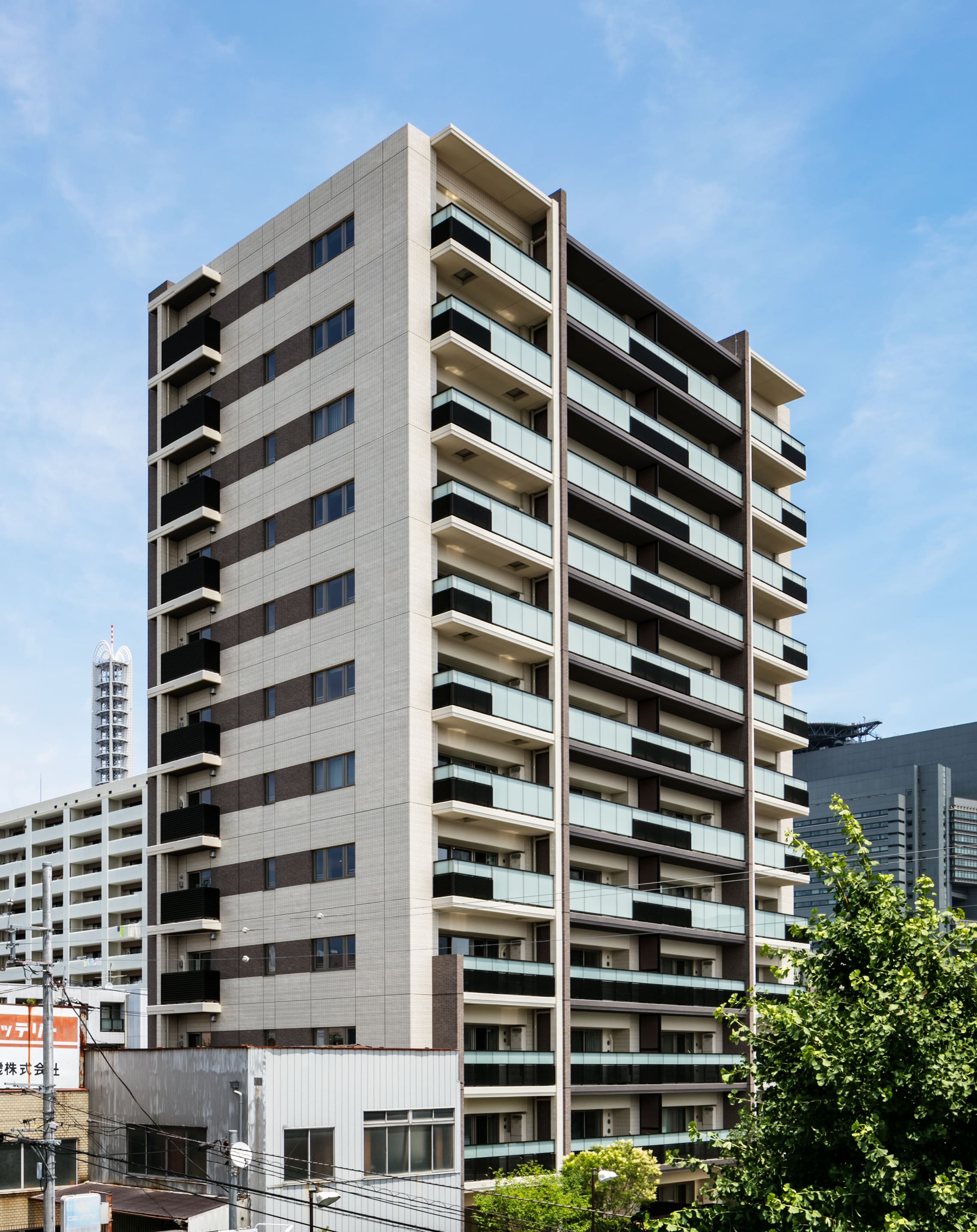 建物のエントランス側の外構は機械駐車場も設けず平置き駐車場で構成し、空地率の多い集合住宅である。敷地入口から建物までの細長いアプローチは車路と一体化させ、視覚的に同一化したデザインとし、緑地・緑化を組み合わせて充実させた空間とした。