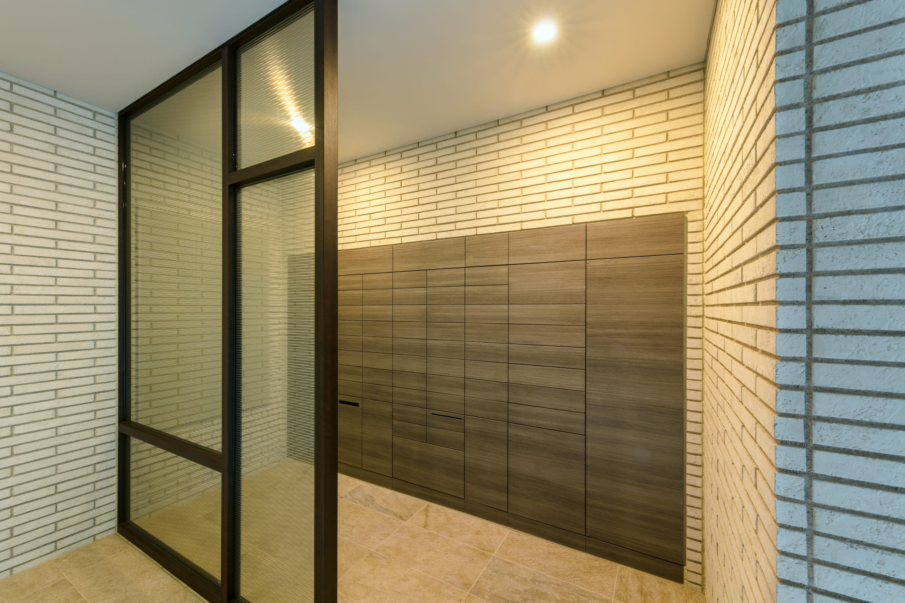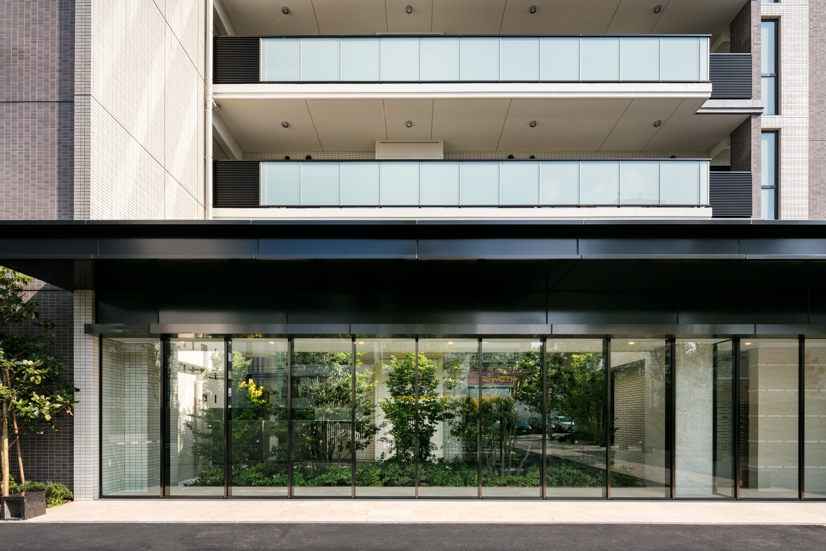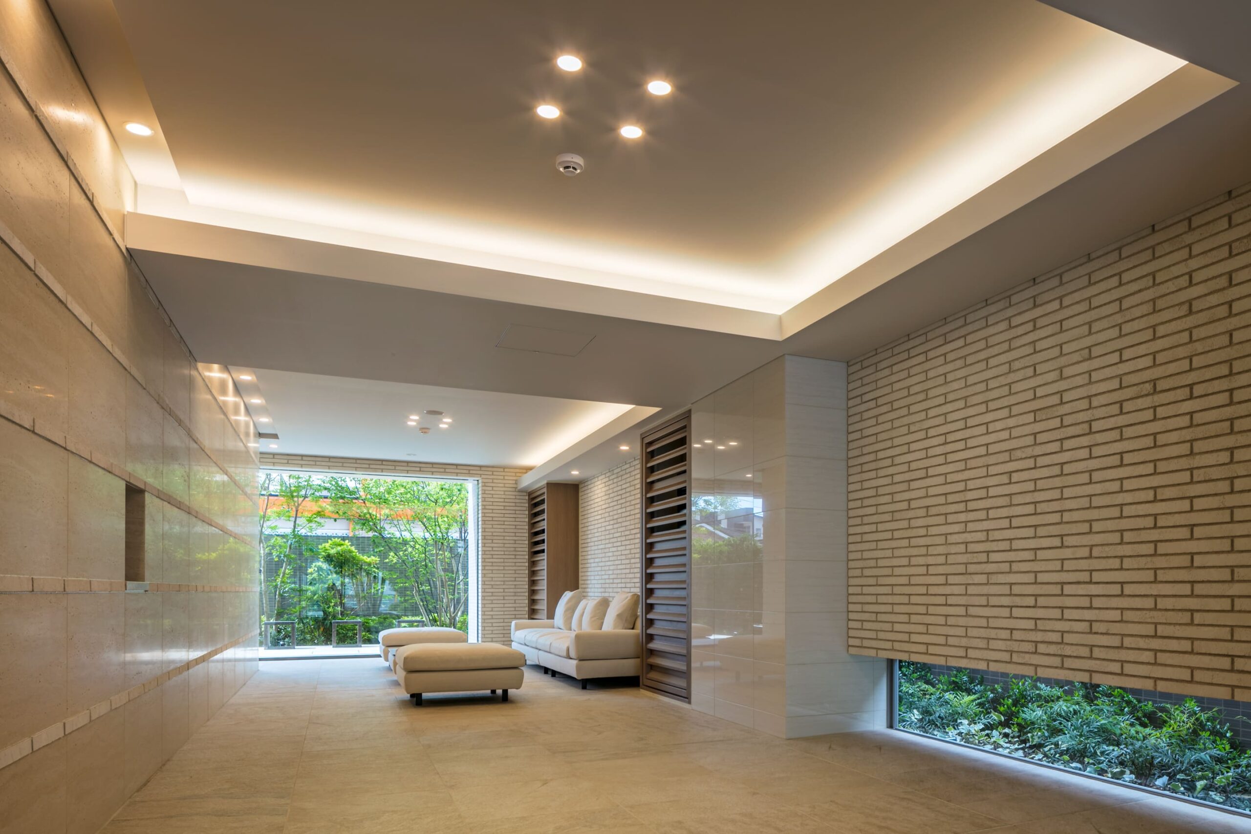 そのアプローチ軸線上にエントランスを配置し、ラウンジから敷地南側のテラスまで貫通する構成となっている。車寄せは大型庇と中庭の緑を隔てたガラスのカーテンウォールに面している。