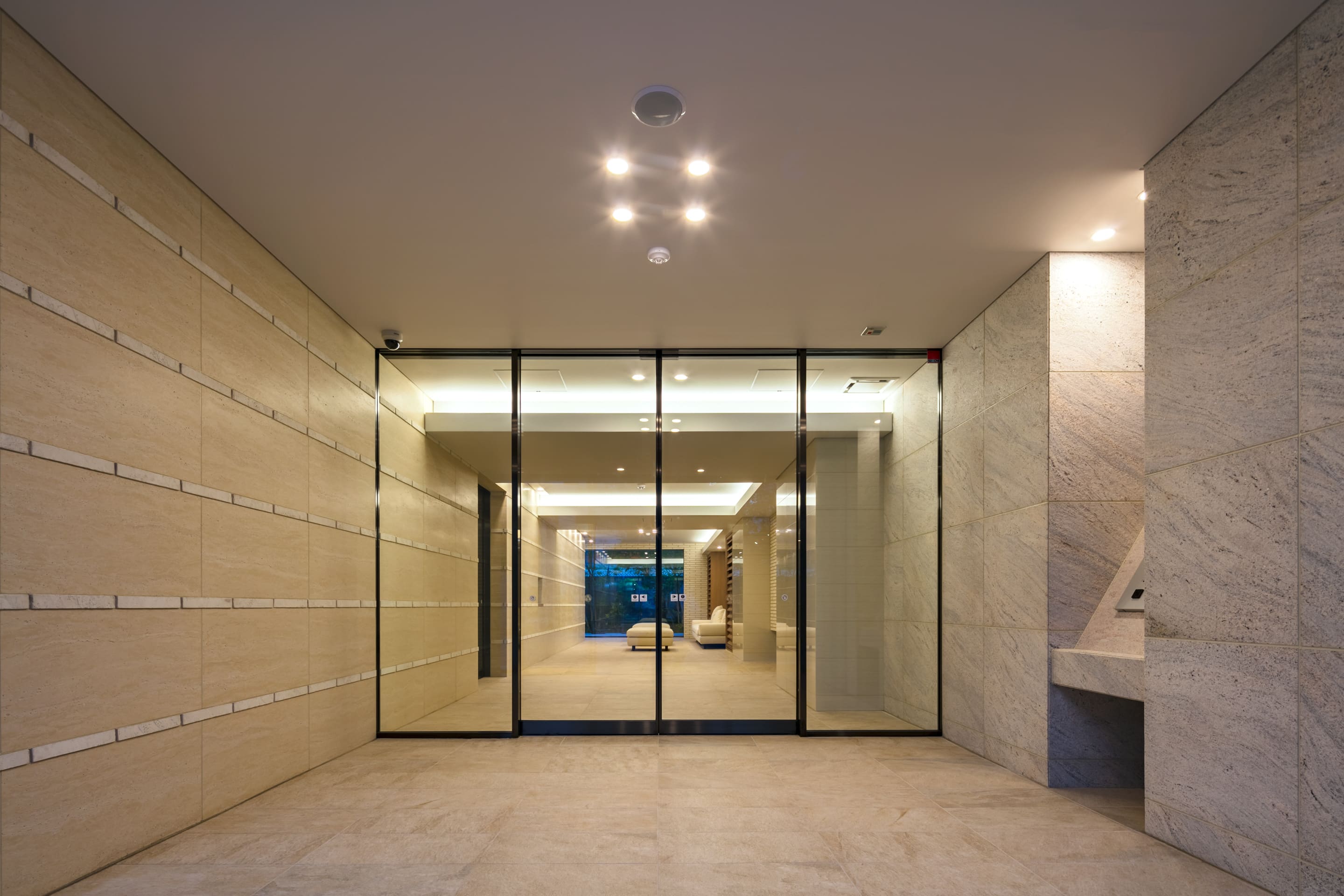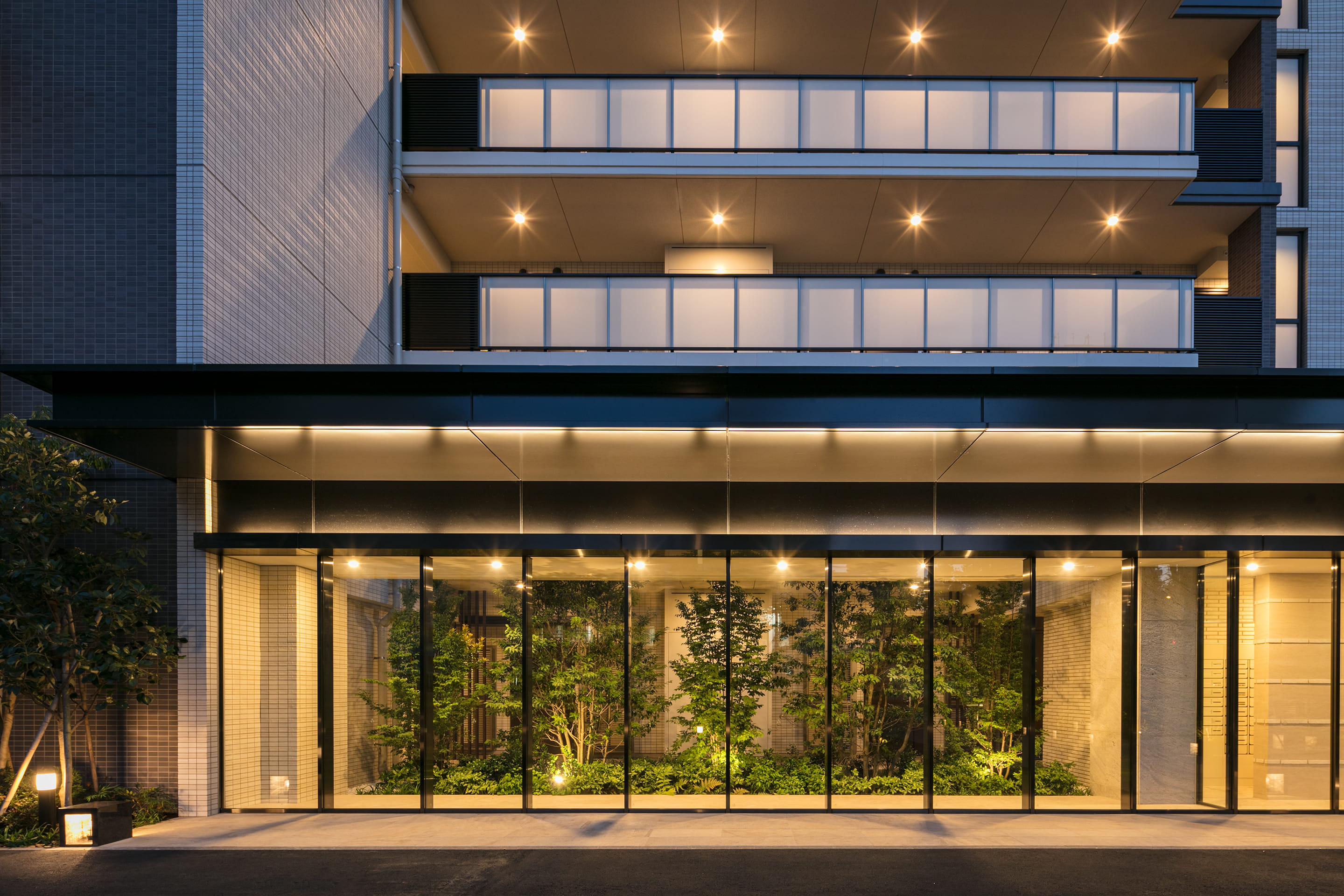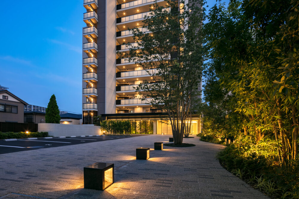 夜間は間接照明をベースにしたほのかな明かりで居住者を出迎える。400ⅹ400ⅹ400㎜のキューブデザインの足元灯は花崗岩製。