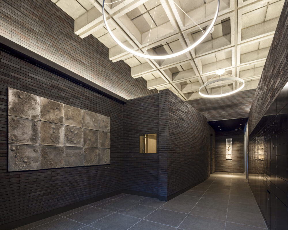野村不動産の賃貸住宅、プラウドフラットシリーズ。1K~1LDK~2LDKまでの賃貸住宅と1階の店舗が併設されている複合建築物。二筋格子をデザインモチーフとした。