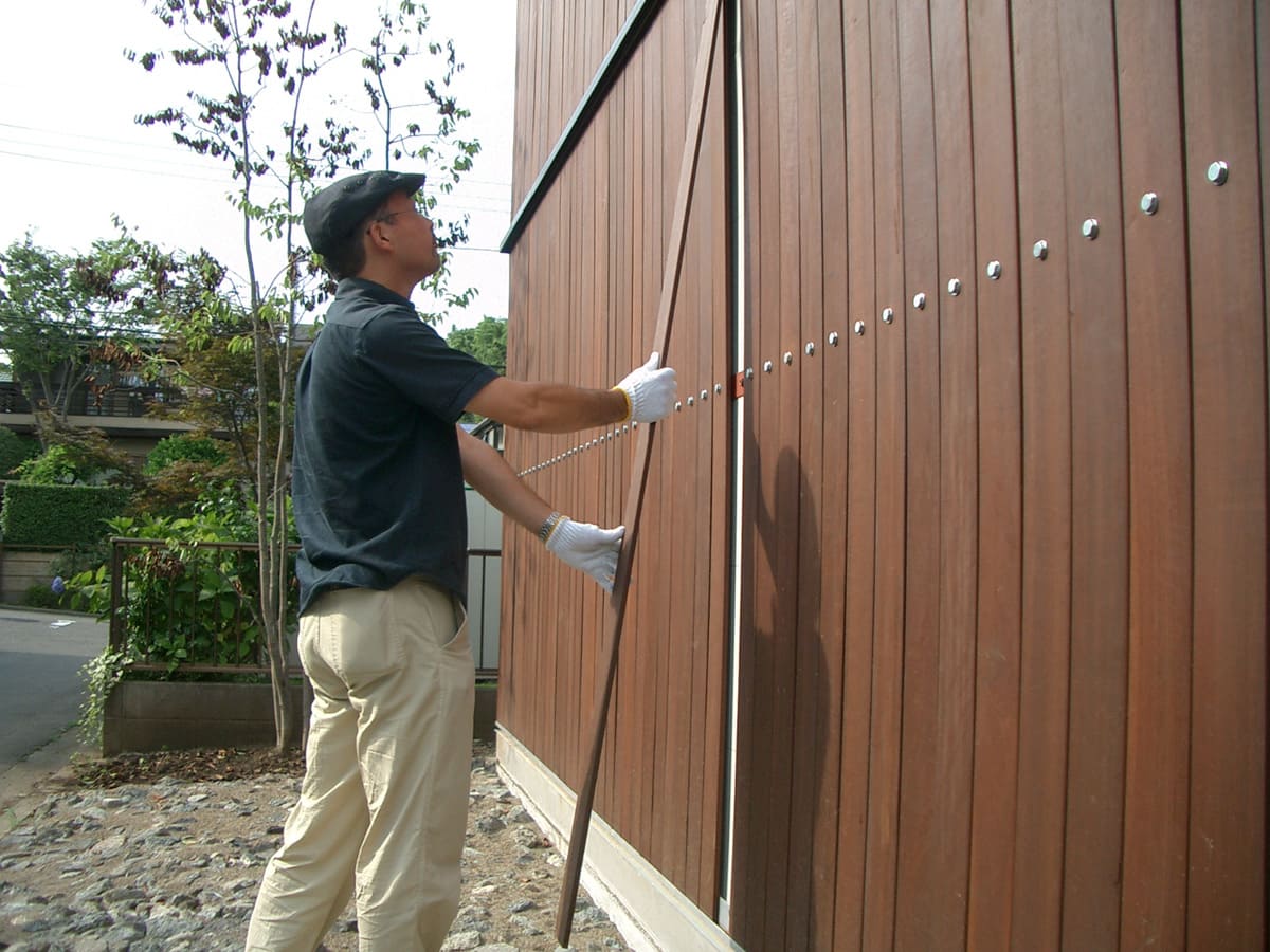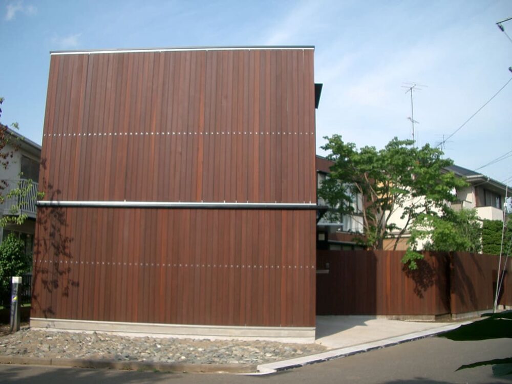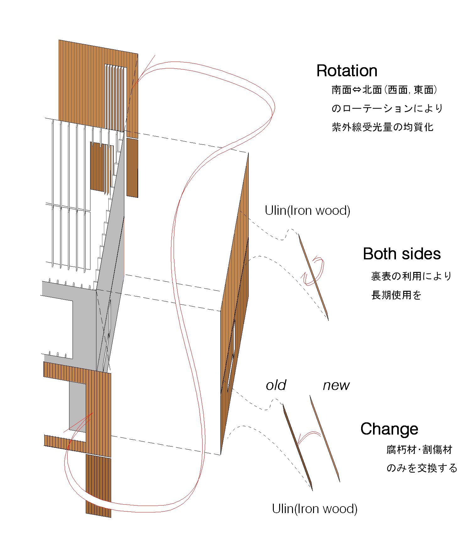 外壁は二重壁として熱をカットし、またそのルーバー状の木板(ウリン材)外壁は取り外し可能となっていて、セルフメンテナンスが可能となっている。