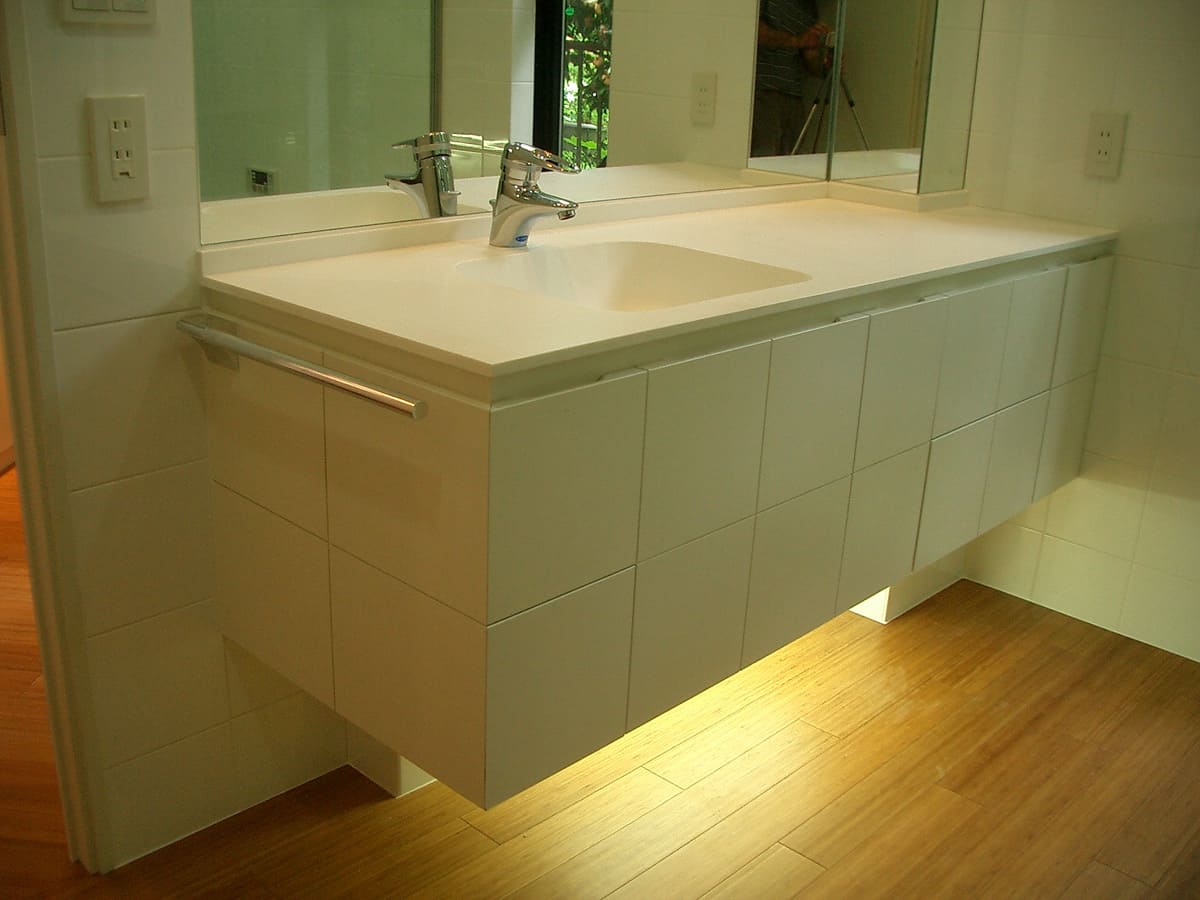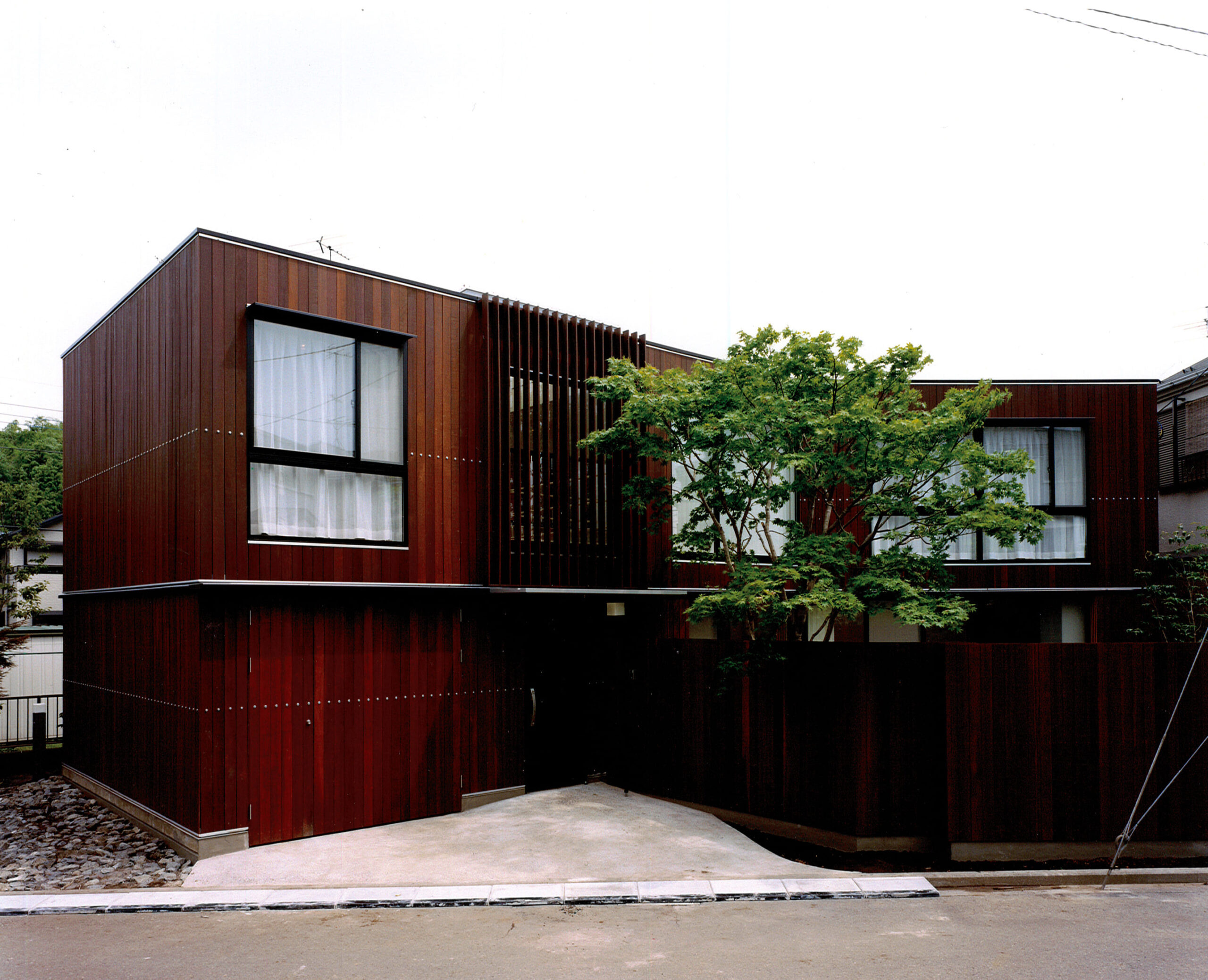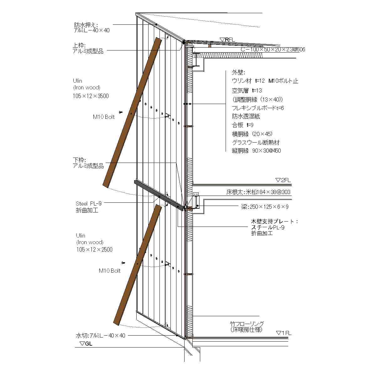 外壁は二重壁として熱をカットし、またそのルーバー状の木板(ウリン材)外壁は取り外し可能となっていて、セルフメンテナンスが可能となっている。
