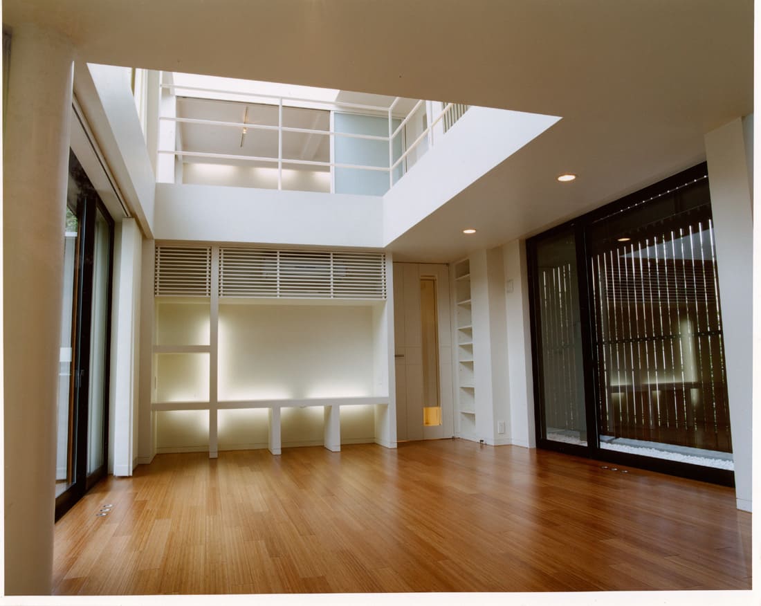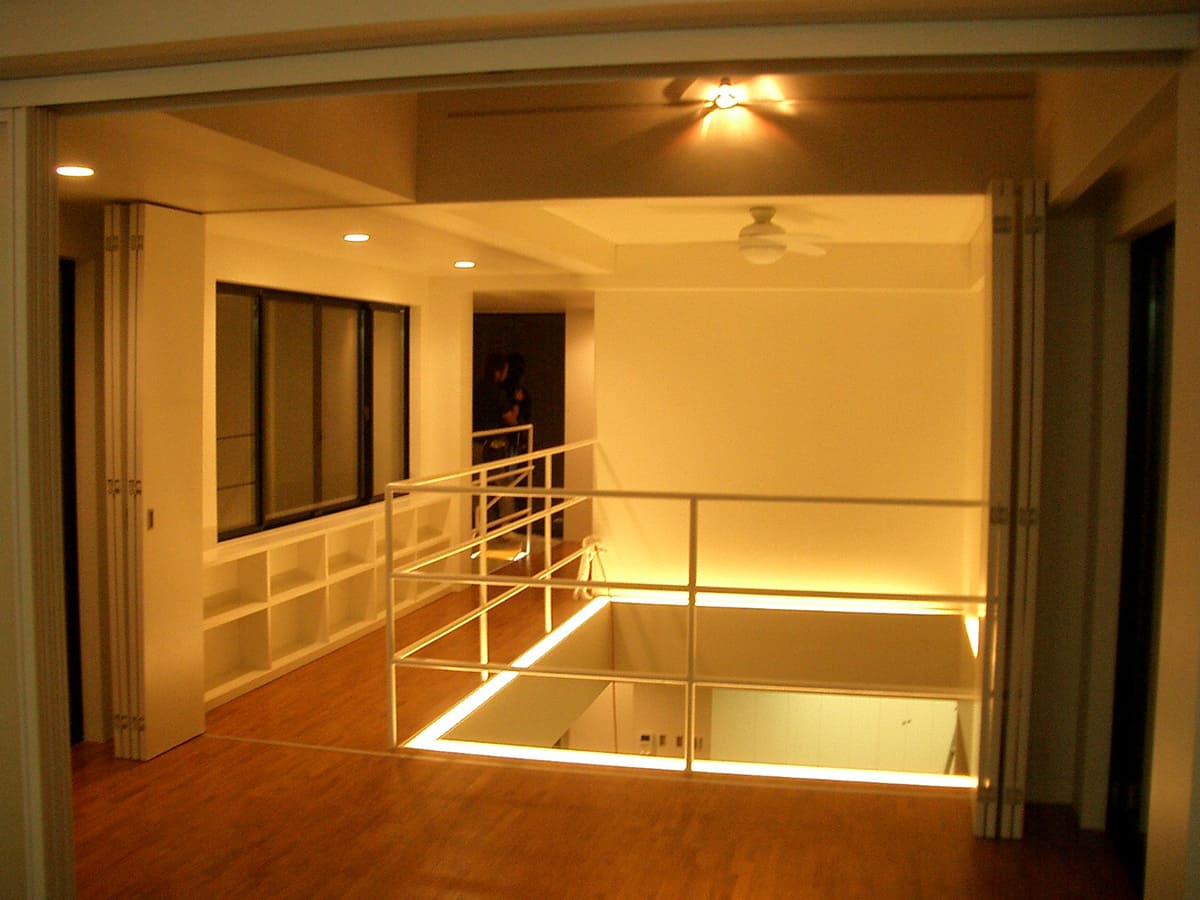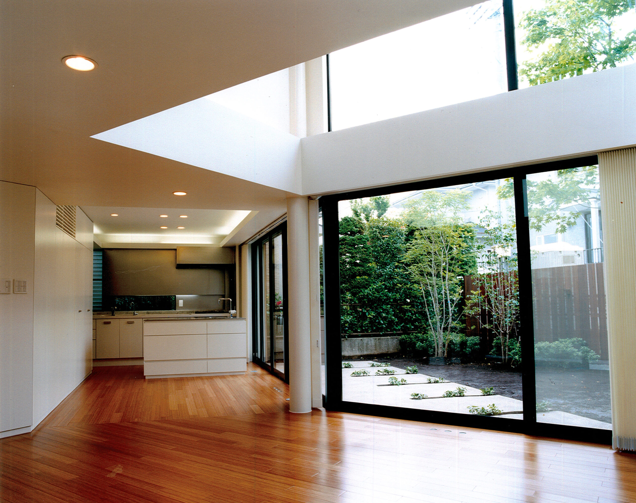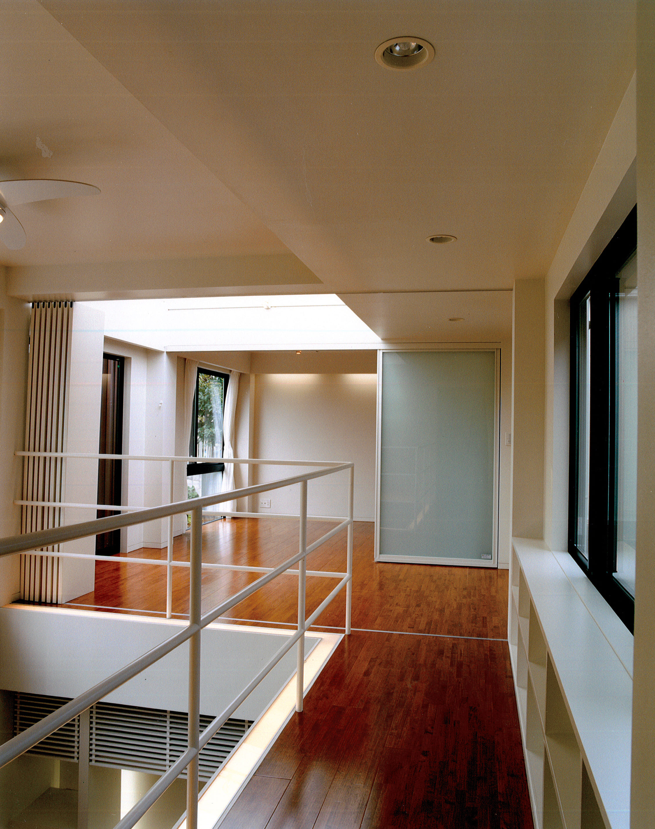 リビング・ダイニング・キッチンを1階に設け、2階は寝室としているが、リビングを通り階段を登る動線、リビング上吹き抜け面に廊下が設けてあることにより、親子が必ず顔をあわせる仕組みとなっている。
