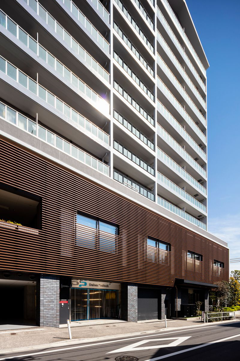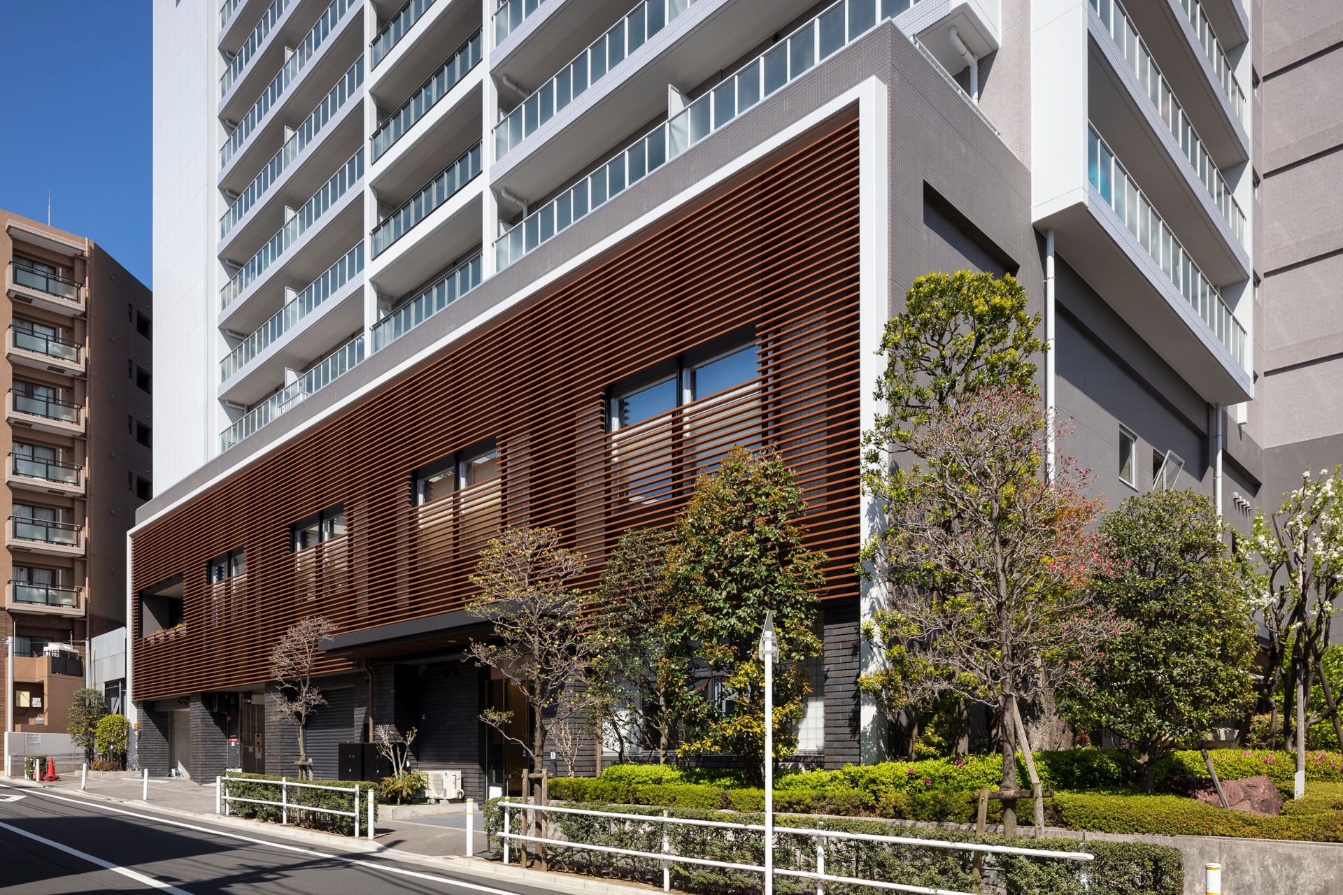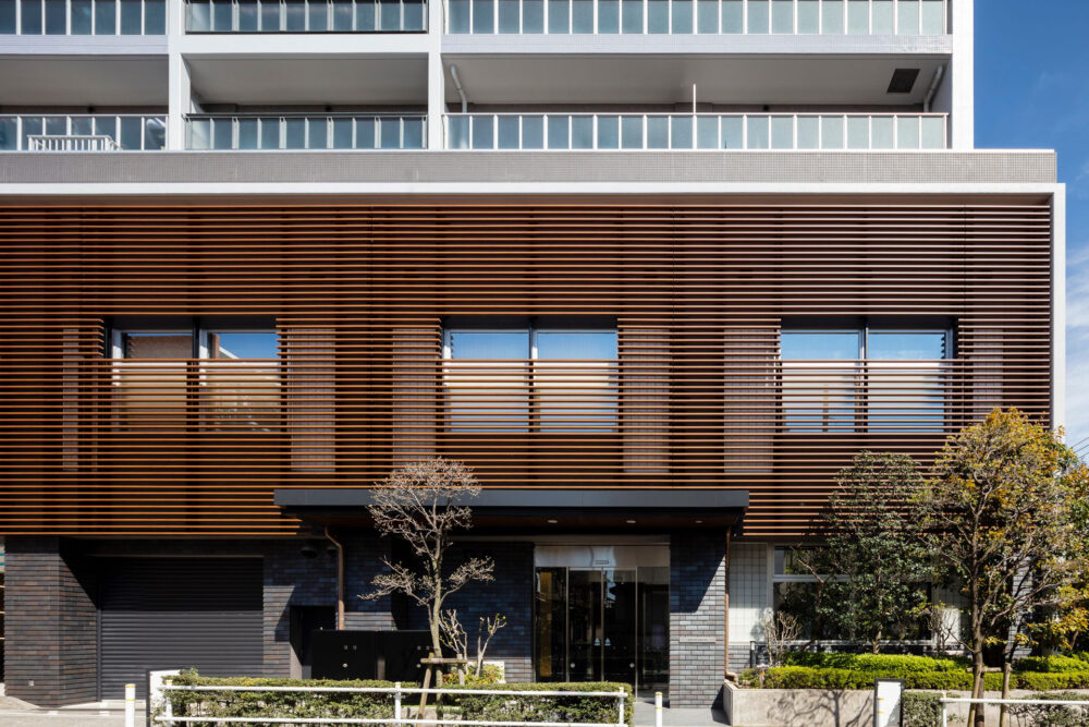 外壁面の2階部分には木目調ルーバーを貼り付けてイメージを一新し、下部にはヨロイタイルを施して、和と現代を組み合わせて「柔らか」で人の集う住居的な雰囲気を持たせた。
