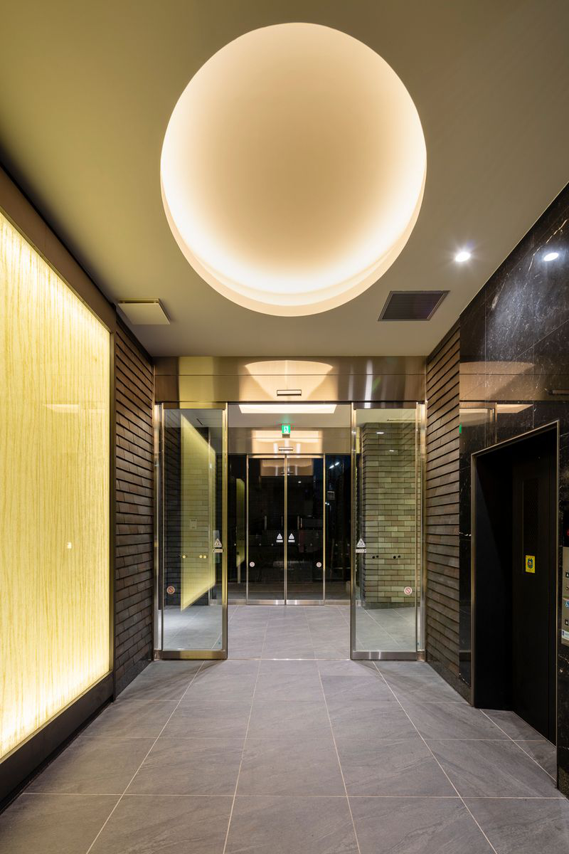 エントランスは和紙入り合わせガラスを使用した光壁の面で構成。元々ある天井高さを有効に活用し、縦方向へのラインを意識させ強調した。