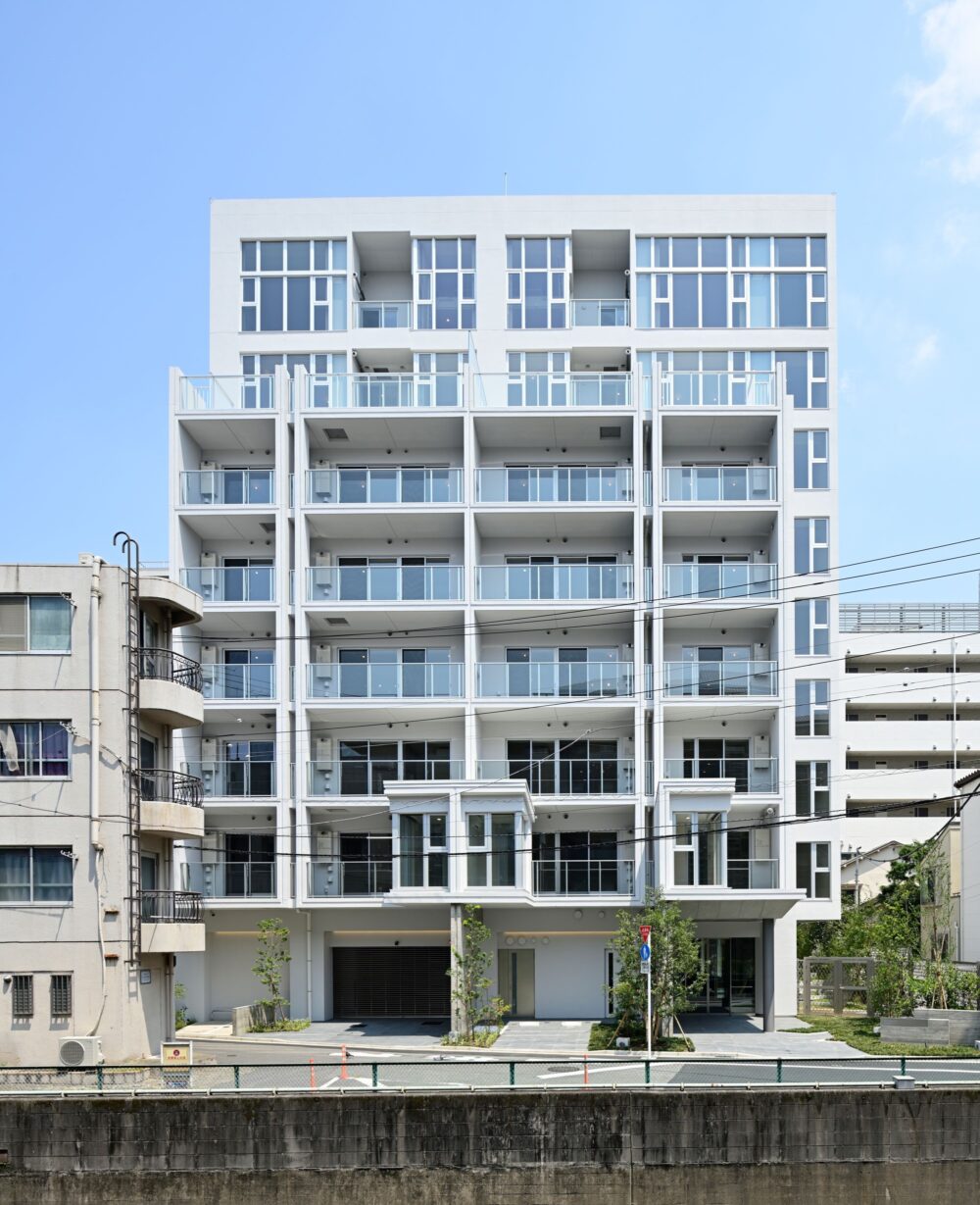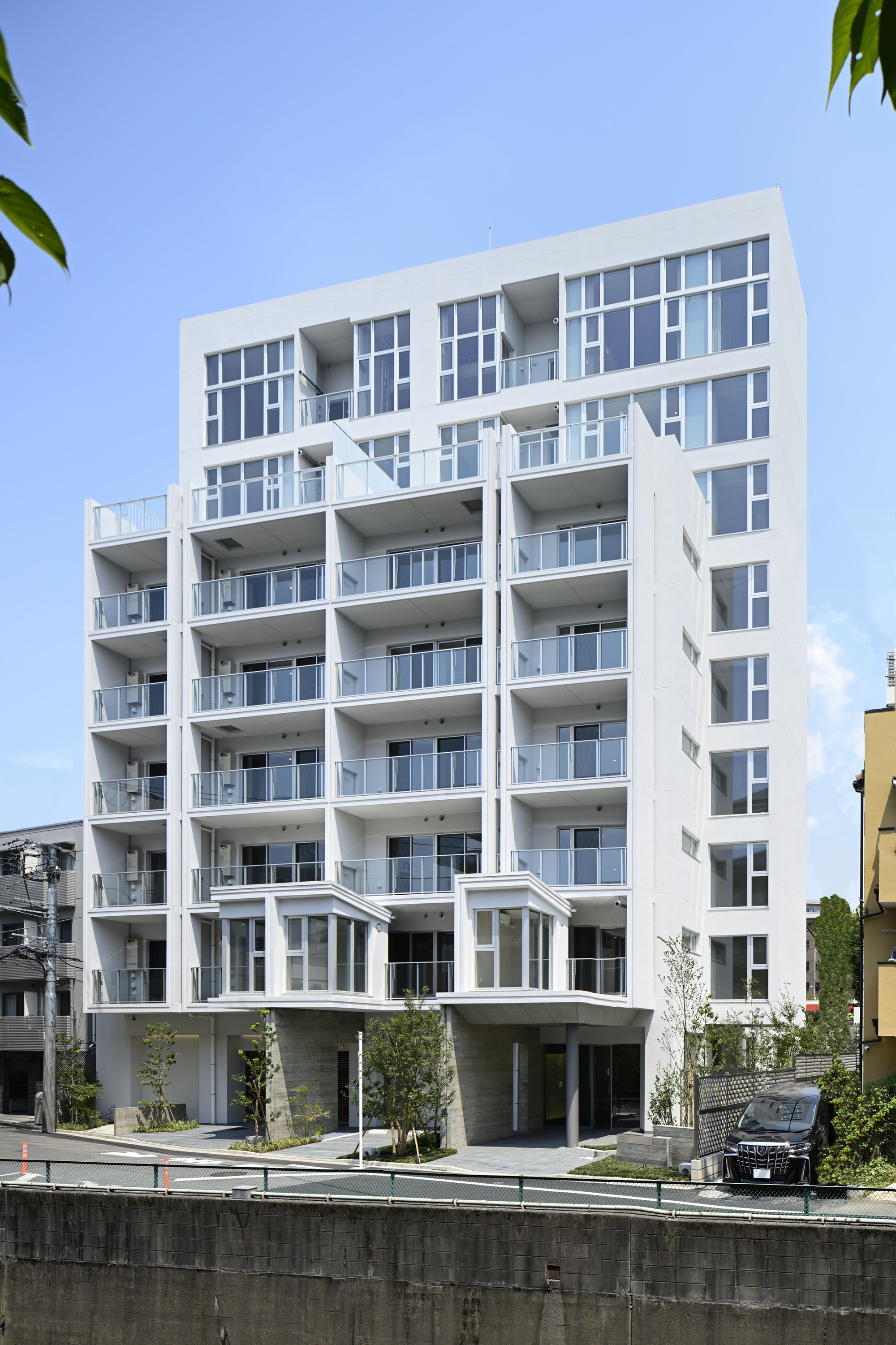 中落合の妙正寺川に面する9階建て77戸、1LDK~3LDK住戸は全て30㎡以上とした賃貸集合住宅。