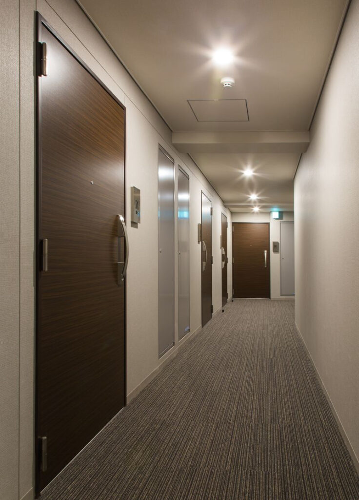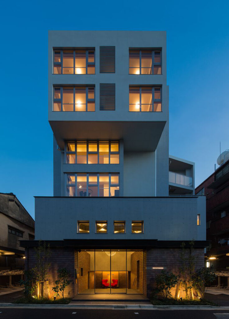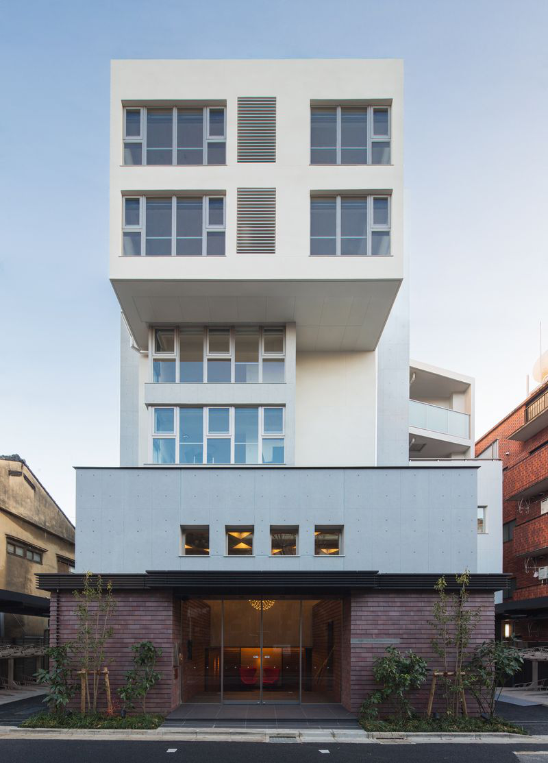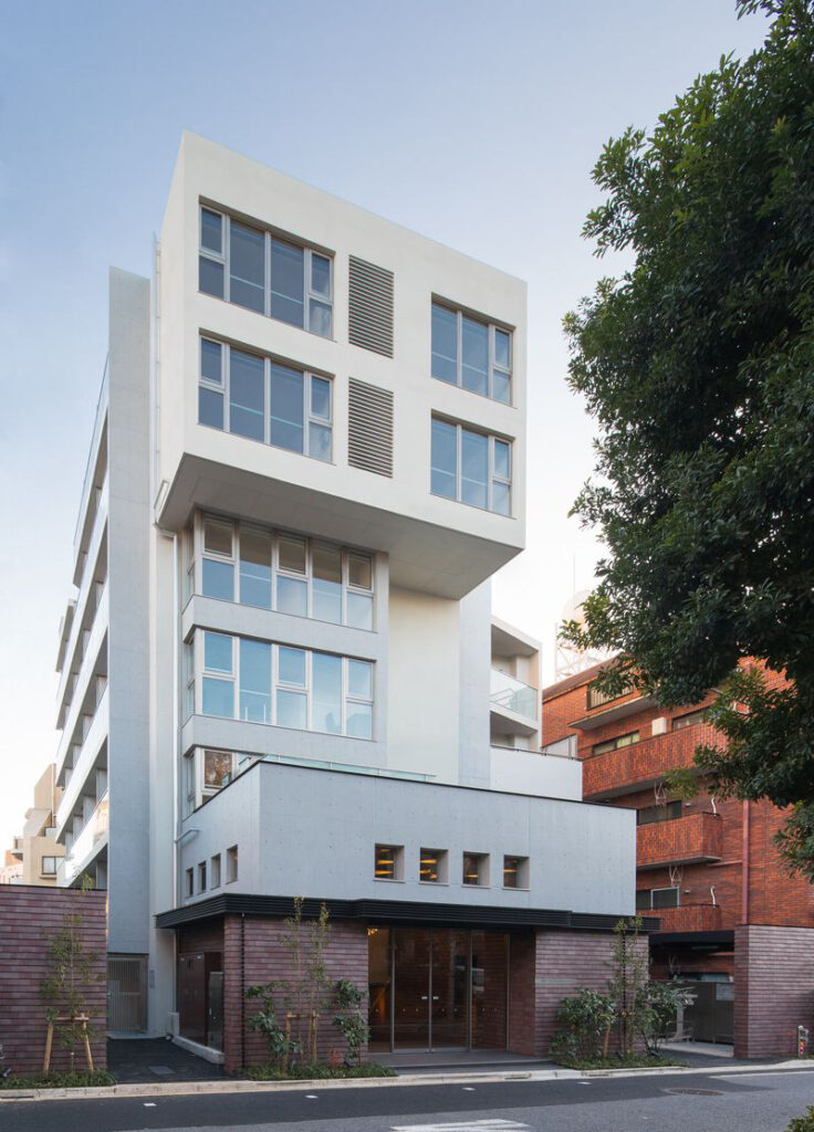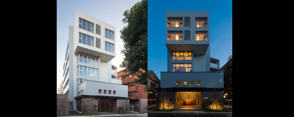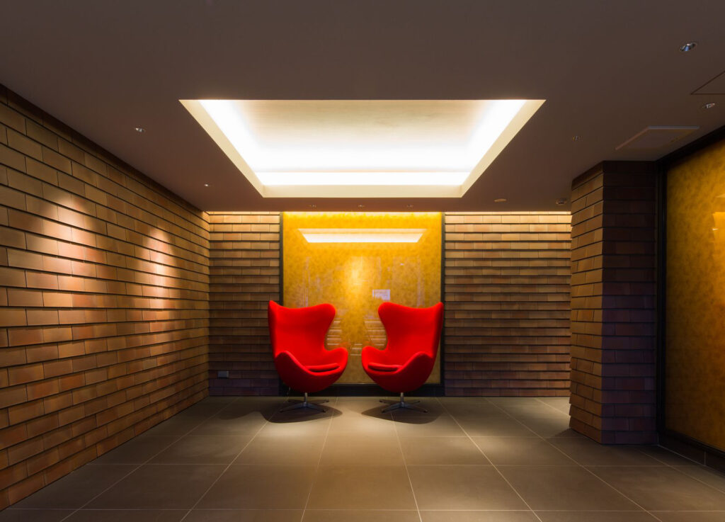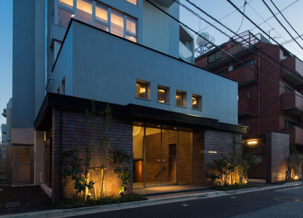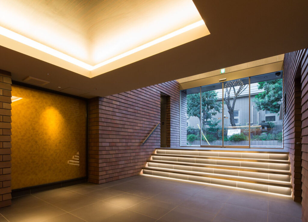 日影規制と天空率によって削り絞られた建物形状の中で、敷地の高低差を利用した高階高のエントランスが生まれた。自然光と籠目文様の格子天井が特徴的なエントランス空間となっている。