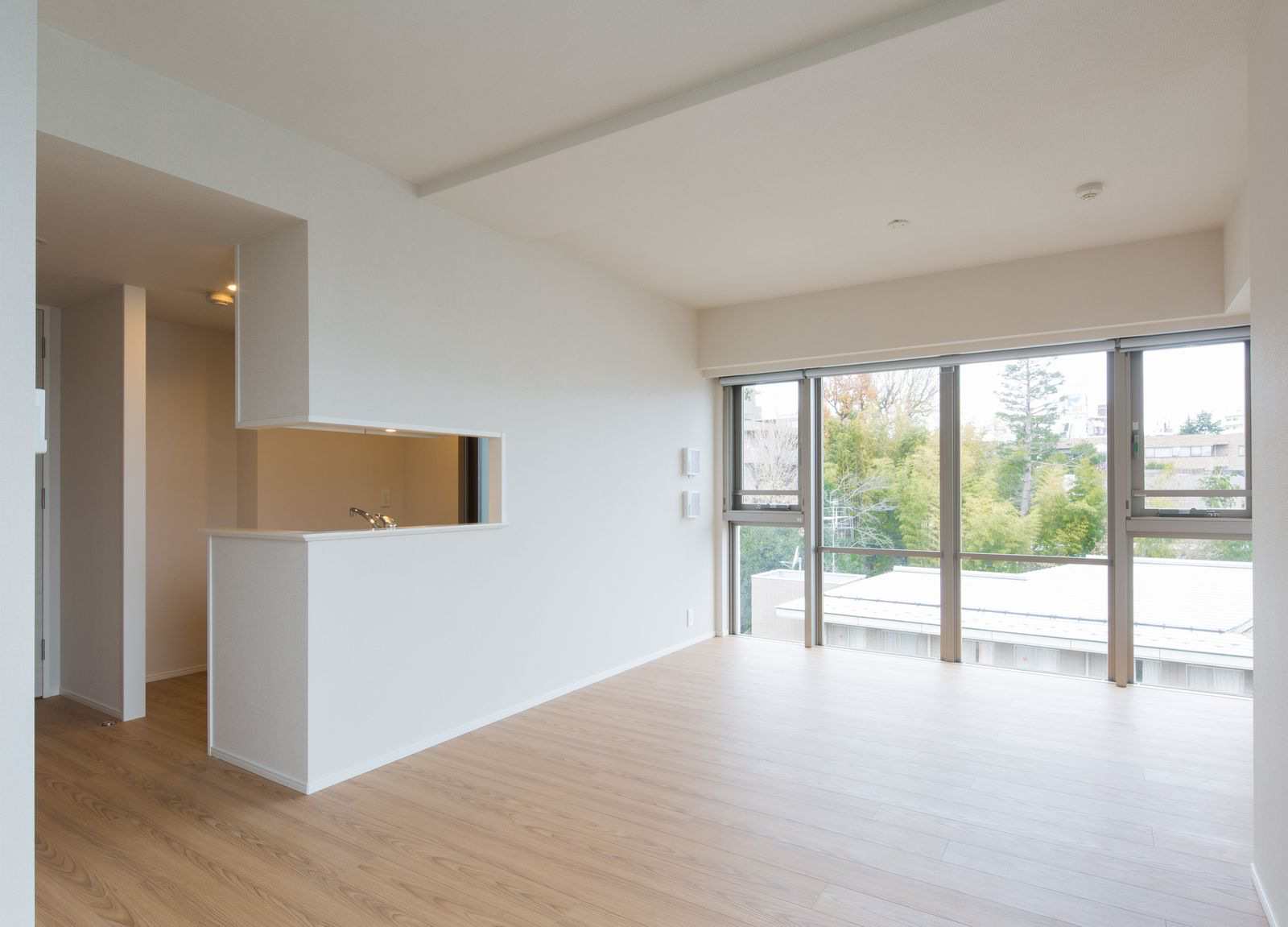 住戸はバルコニー面を逆梁とし、部屋の奥まで自然光がいきわたるような設計となっている。
